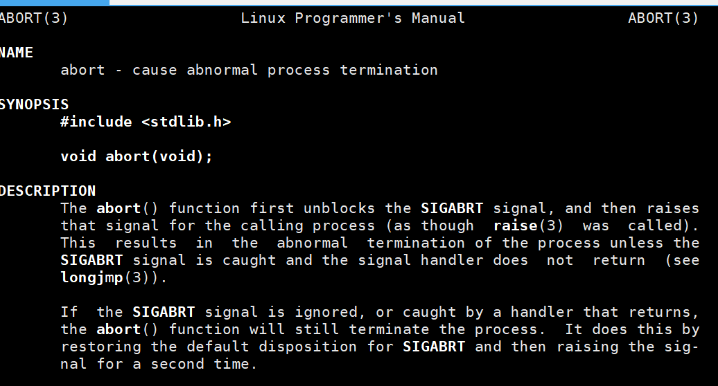 abort函数是一个终止进程的函数,它会对调用的进程产生并发送 SIGABRT 信号,也就是6号信号,这个信号和9号信号都是终止进程的信号,但区别在于,9号信号不能被设置成自定义处理方式,即使被设置成了自定义处理方式,操作系统仍然会按默认方式处理;而6号进程可以被设置成自定义处理方式,它也会执行自定义处理方式来处理信号,但执行完自定义方式以后还会再执行默认处理方式。