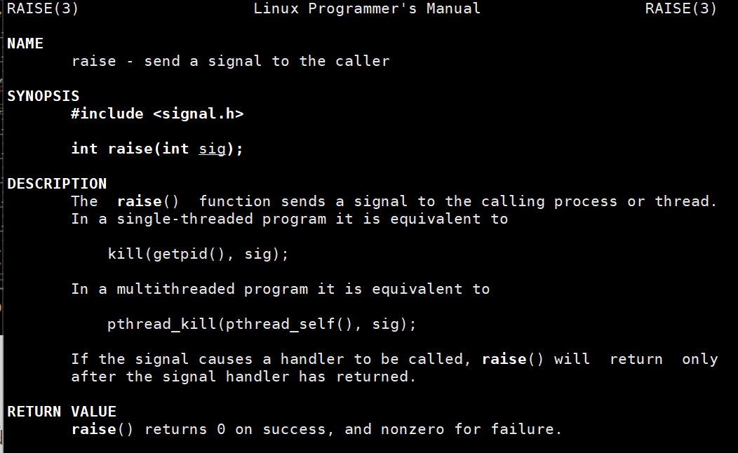 raise函数的功能和kill函数的功能几乎一样,区别在于kill函数是给任意的指定进程发送指定信号,而raise是给自己发送指定信号。参数只需要传入信号编号指定要发送哪个信号就可以了。如果成功则返回0,否则返回非零。