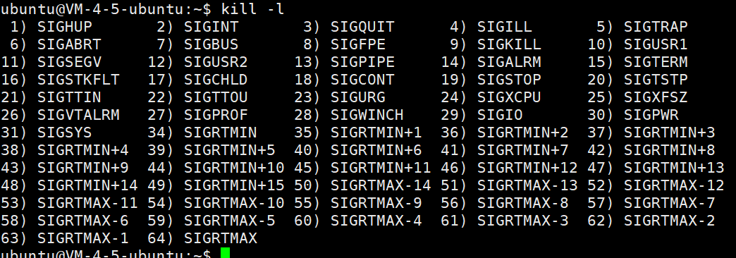 在操作系统中同样有着一套信号系统,操作系统的信号针对的对象是进程,进程在运行的时候除了执行自己的代码,还得要有能够识别信号和处理信号的能力。这些能力其实本质上是设计操作系统的程序员规定的,是一套约定好的信号标准,不同的信号代表不同的含义,针对不同的信号进程也有不同的处理方式。比如我们在Linux操作系统下输入指令kill -l就可以查看操作系统中的信号。