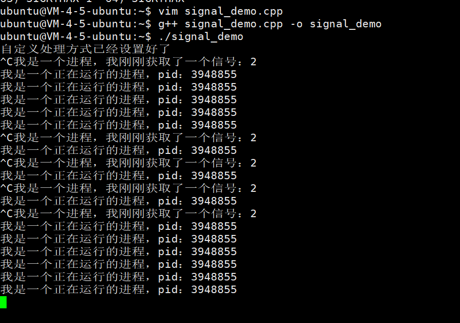 程序运行起来以后查看效果,当程序一直在运行的时候,我们按下ctrl + c它就能执行我们设置好的自定义处理方式,不再使用原来默认的处理方式。