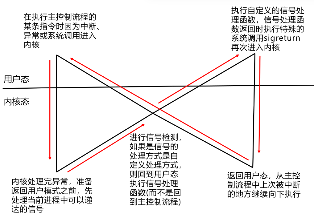 简单说就是:程序被打断→内核处理→先处理信号→执行信号函数→再回到原来的流程。