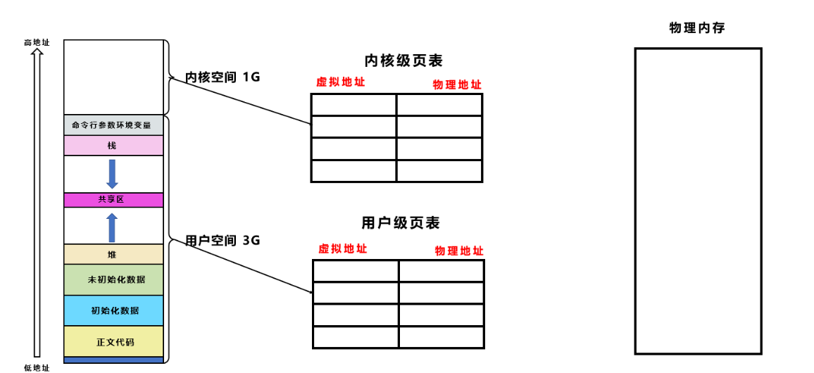 进程会维护一个虚拟地址空间,其中虚拟地址空间被分成用户空间和内核空间。对应的页表也有两份,一份是内核级页表,一份是用户及页表。内核级页表是所有进程共享的页表,只有一份,进程访问该页表需要有权限;用户级页表是每一个进程都有一份,而且大家的用户级页表都不一样。内核级代码是将内核级别的代码和数据映射到物理内存上,正是因为这个机制,无论什么进程都可以找到内核的代码和数据,但前提是该进程要有权利访问内核级页表。
