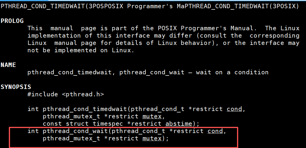 pthread_cond_wait函数可以设置线程等待条件满足,如果不满足的时候线程会阻塞式的等待。第一个参数cond传递指定的条件变量,代表在该条件变量上等待。第二个参数传递指定的互斥锁,这个函数需要传递互斥锁的原因是当线程在持有互斥锁的时候被阻塞等待条件变量,会自动解锁给其它线程使用,当阻塞结束的时候,该函数也会自动帮助线程重新获得互斥锁,然后才返回。