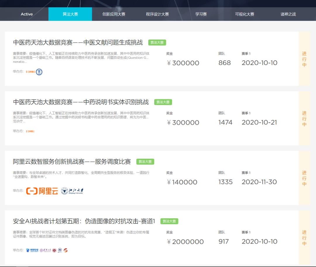 https://tianchi.aliyun.com/competition/gameList/activeList