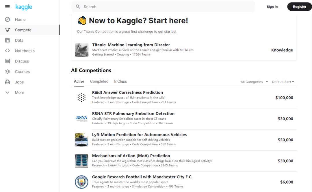 推荐两个参加竞赛的地方,一个是国外的 Kaggle,另一个是国内的阿里云天池。