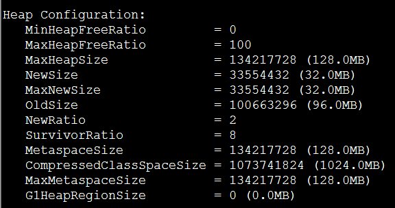 JAVA_OPTS="-server -Xms128m -Xmx128m -XX:MetaspaceSize=128m -XX:MaxMetaspaceSize=128m -XX:MaxNewSize=32m"