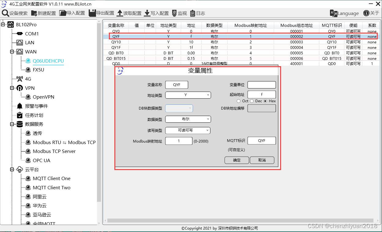 第一步、PLC与网关BL102和电脑在同一局域网内,用电脑打开BL102的配置软件,添加相关的数据点到网关的采集区域,这里我们演示下Q区域和Y区域的数据添加方式。