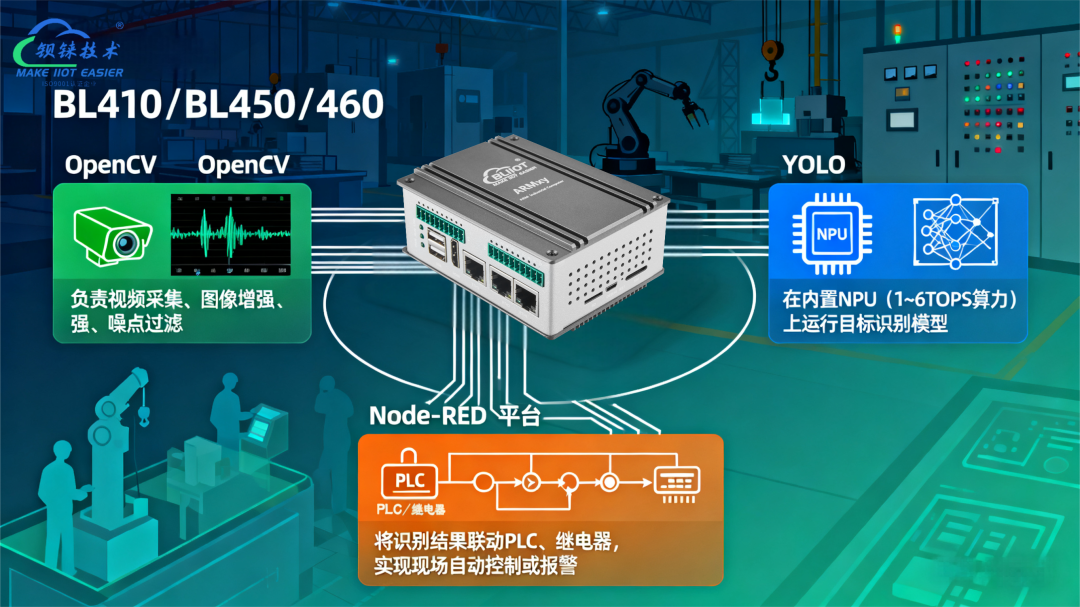 Node-RED平台 将识别结果联动PLC、继电器,实现现场自动控制或报警。