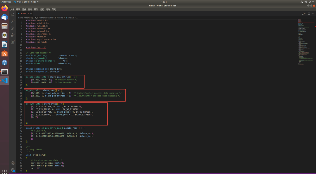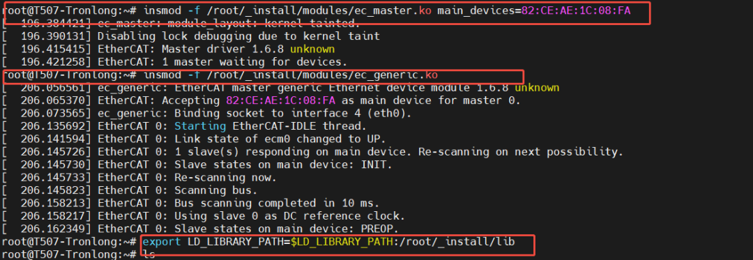 注意是必须是RT linux内核,以T507为例子,将编译好的master驱动模块和网卡驱动模块分别加载进内核,MAC地址为eth1网卡地址,注意加载的先后顺序,然后设置库的环境变量,如果已经将库放入/usr/lib这种已经包含的系统环境变量目录里面则省略。因为我已经提前将设备连接,这时已经扫描到了从站0,处于PREOP的预操作状态,需要用户自行根据ESI文件去做PDO过程数据分配操作。