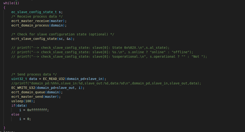 在每个通信周期中,主站会自动将输出数据打包到数据帧的对应位置,并从帧的对应位置解析出输入数据。对用户程序来说,这就像在读写本地内存一样简单。