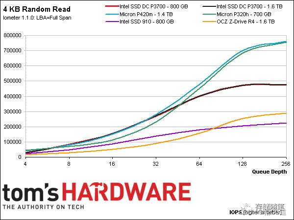 如果要完全释放NVMe SSD的IOPS性能,设计人员要先做好评估呢,因为当队列深度达到一定程度后,NVMe SSD的IOPS才会达到最佳。如下图(来自Tom'Hardware),六块NVMe SSD均在队列深度128以上才达到最佳的性能。