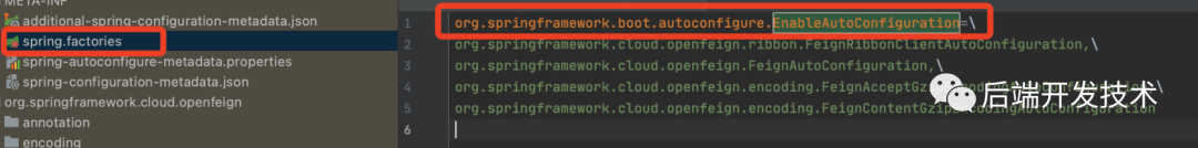 还是以 Feign 为例,FeignAutoConfiguration 这个类就是一个 Feign 的自动装配类,我们来探究一下他是如何生效的。