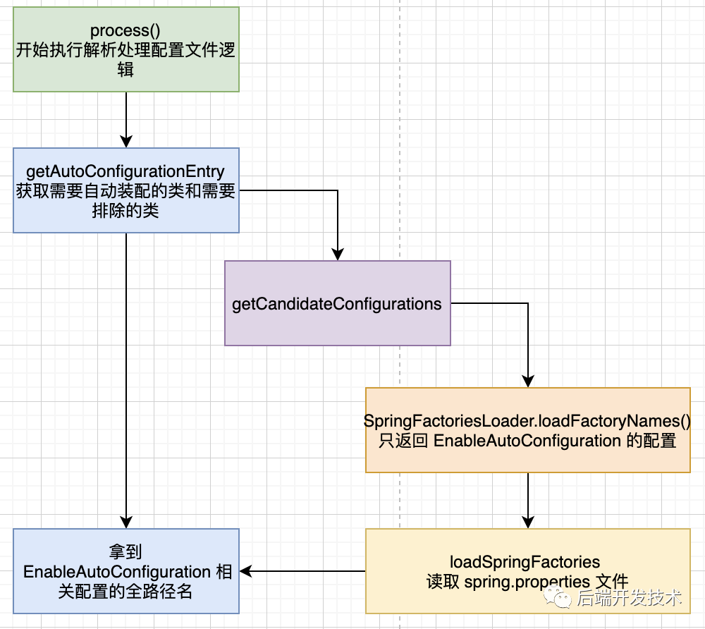 在 process() 方法中主要做了一件事,读取并解析 spring.factories 配置文件中的信息,将这些配置文件对应的全路径类名都放入 AutoConfigurationEntry 集合中。接下来详细解释相关逻辑。