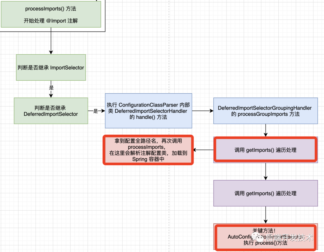 AutoConfigurationImportSelector 继承了 DeferredImportSelector 接口,在 Spring 生命周期处理 BeanFactoryPostProcessors 的时候会对配置信息进行后置处理,这是会调用到 AutoConfigurationImportSelector.process 方法。