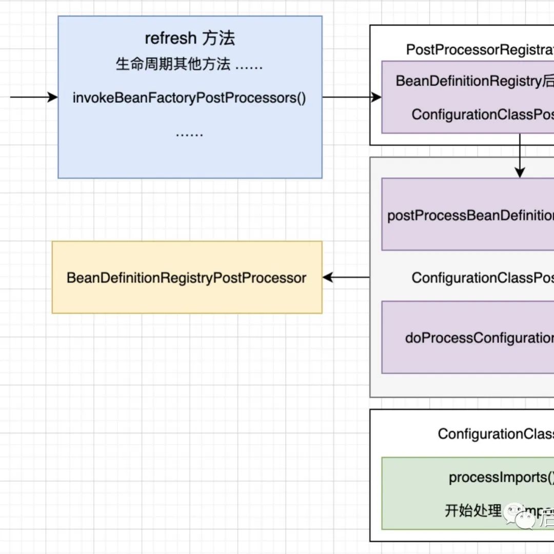 回到之前执行过程中的processGroupImports 方法(在前面的图片已用红框标注了出来),这里会调用 getImports 拿到配置类信息,然后再次调用类信息,然后递归调用 processImports,这个方法之前的文章已经解释过了,如果是配置类会解析并注册 Spring 的 Bean 信息,具体请自行查看之前文章。