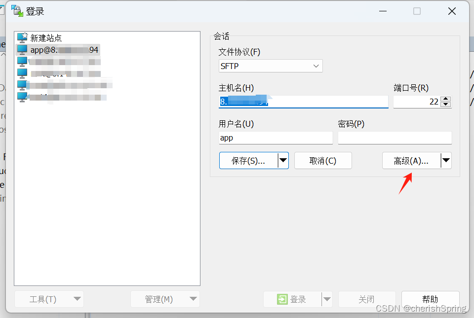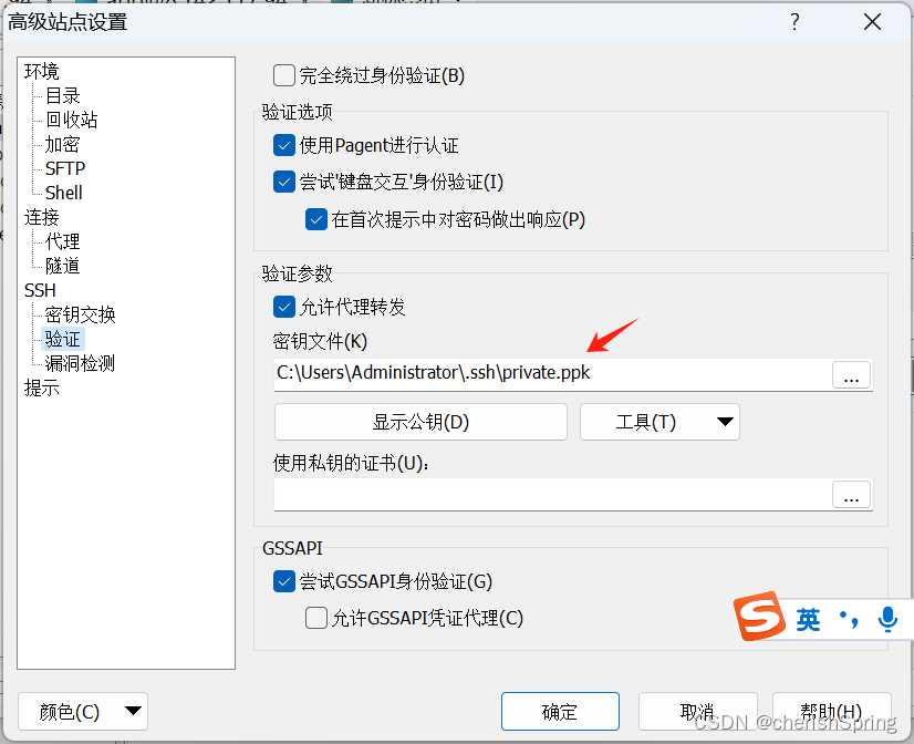 4.使用winscp以ssh方式远程访问服务,高级->SSH->验证->选择密钥文件