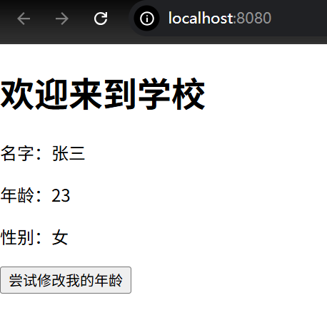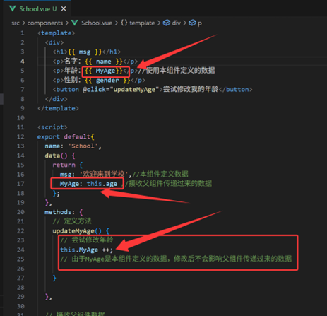 在School.vue中实行操作:修改了年龄为本组件定义的数据,用其来接收父组件传递过来的数据,而且本组件定义的数据修改数值,不会影响父组件传递过来的数据。