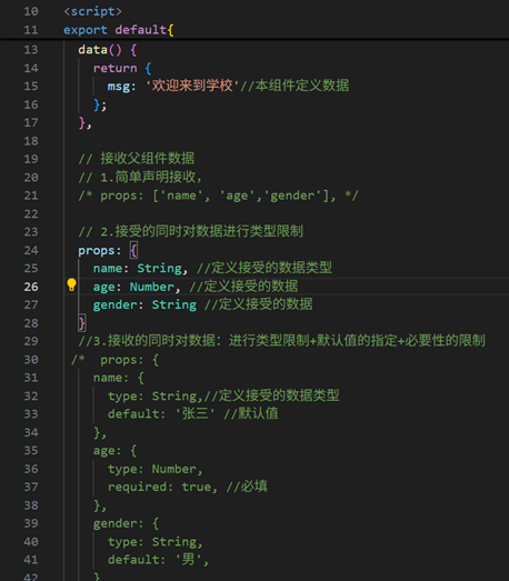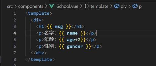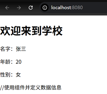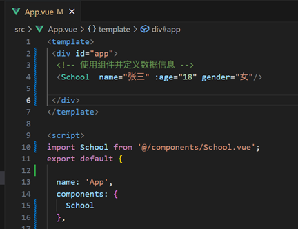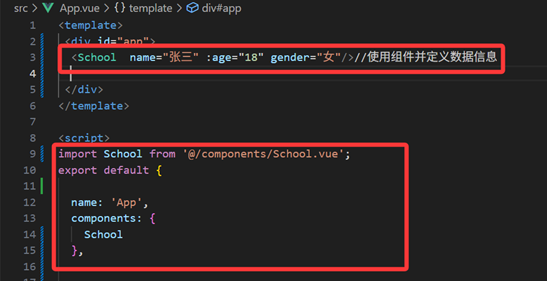 在父组件中引入子组件后,在子组件标签内定义属性数据,子组件School将使用props配置进行接受数据: