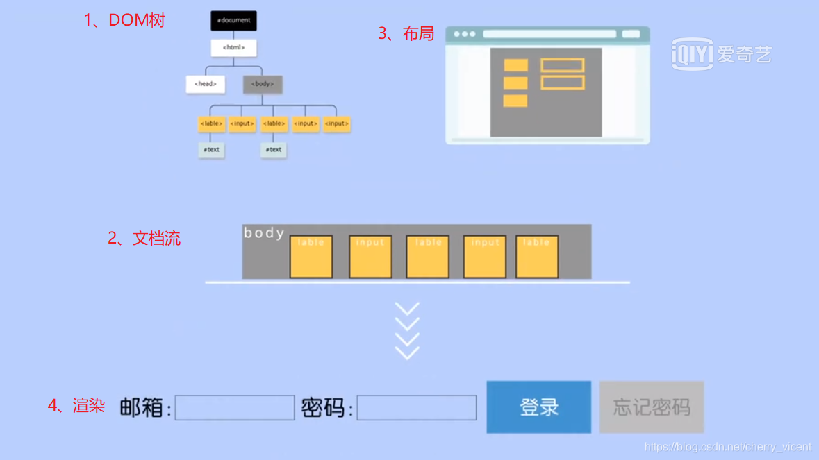 第二步是按照从上到下、从左到右的顺序,将树上的节点压入文档流。我们看看从body节点开始,然后是body节点下的input节点label节点,一个接一个的被压入文档流。第三步是布局。布局的时候因为是行内元素无法占满一行,会在同一行里挨个排列,如果调整页面宽度让它变窄,行内元素会因为一行放不下而换行。第四步是渲染。最后将它们渲染就完成了这个页面。可见文档流与网页之间的关系,其实就是将一维节点映射到二维空间的关系。(备注:块级元素,每个盒子都会独占一行。遇到图片只需把它当作设置了宽高的普通行内元素处理。)