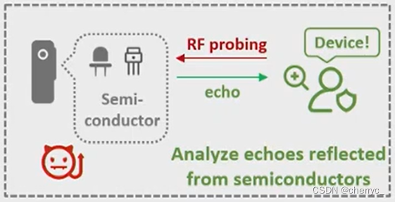 - 基于信号反射:发射强电磁辐射信号并检测由器件中的PN结反射回来的二阶谐波(e.g. Illumination)⇨不能区分于其他电子设备