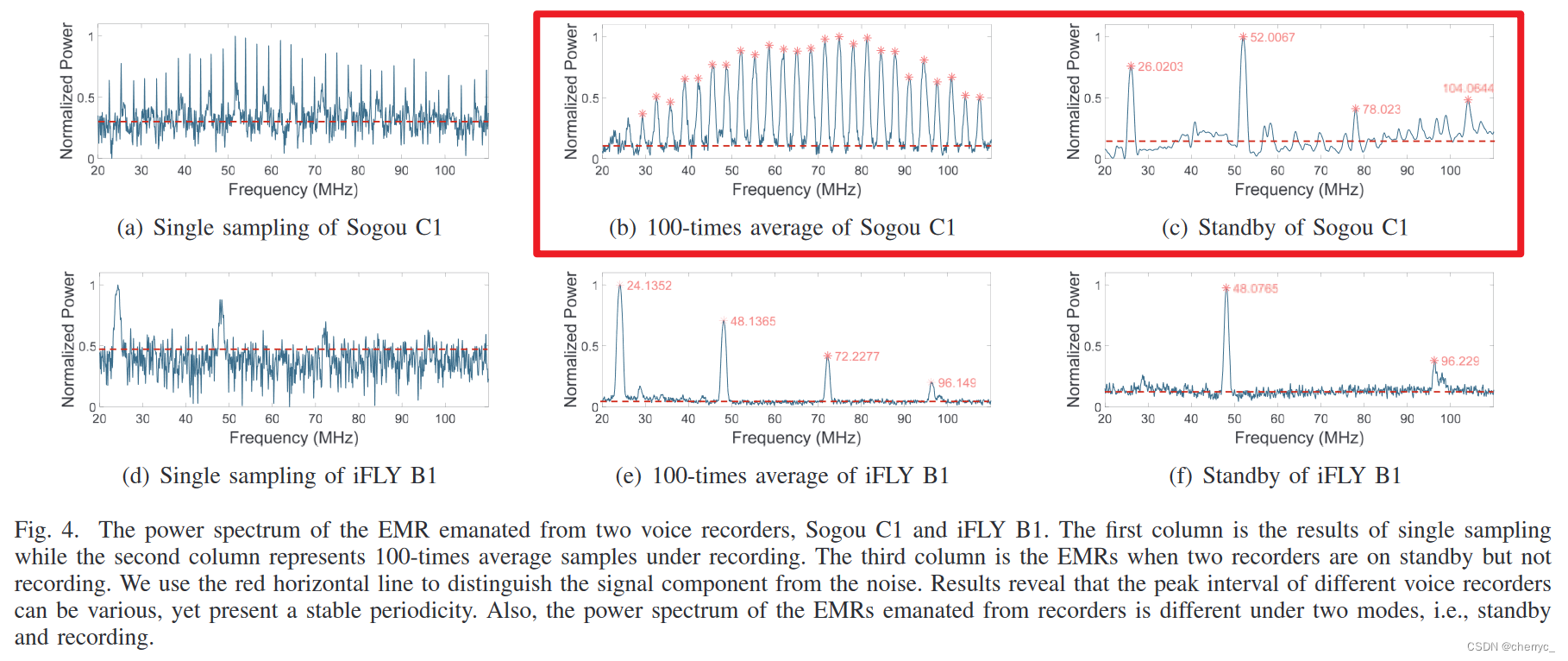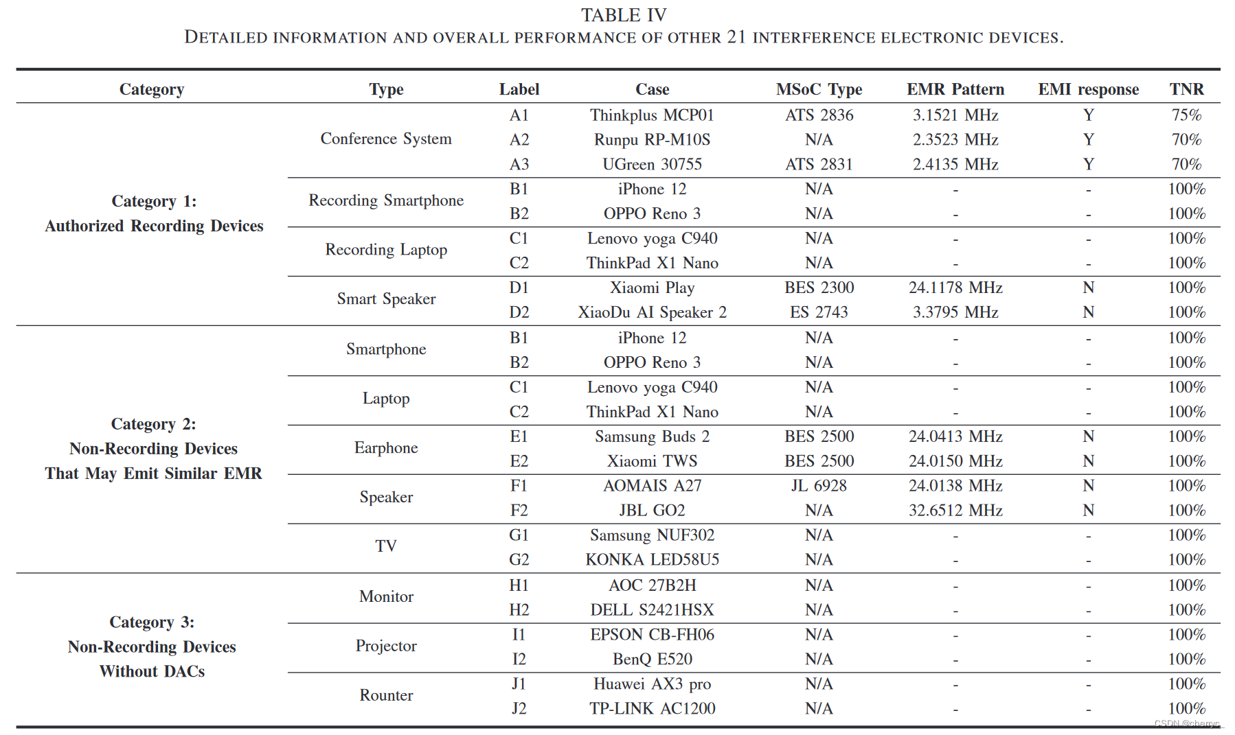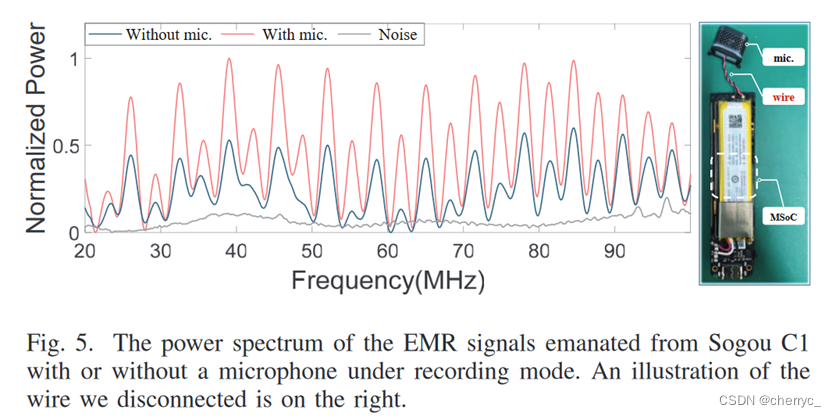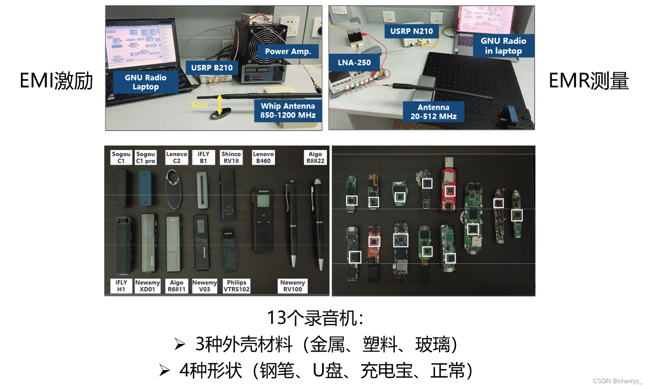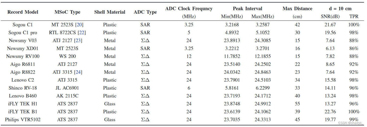 第一类设备中的会议录音系统不只发出和录音机类似的EMR,并且还会对EMI激励有响应【因为有相同系列的MSoC】;智能语音设备虽然发射类似EMR,但是对10cm处发射的EMI基本没有响应;手机和笔记本没有和录音机类似的EMR,原因可能有两点:首先这些设备有更好的电磁兼容性,可以减少电磁辐射;其次智能手机的ADC并没有像录音机一样集成在MSoC上,减少了EMR信号的耦合