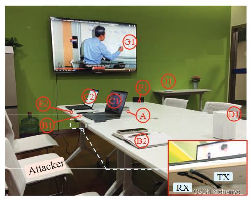攻击者携带一个录音机并且自行决定是否进行录制,录音机必须放在桌子上或者椅子上(检测范围内),在房间里呆2分钟。