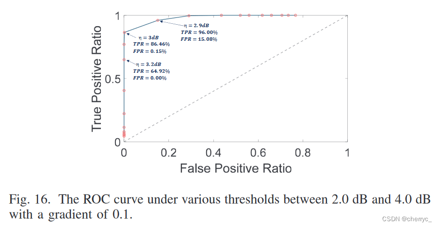 - 判定阈值η设置为3dB时可以平衡真阳率和假阳率(这个ROC曲线的阈值和常规的应该不同)