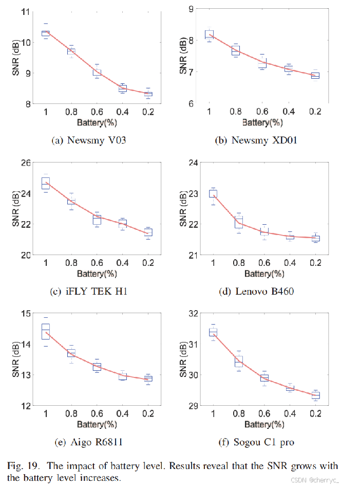 分别在10cm处测量了(20次)6款设备在5种电量水平下EMR信号的SNR。发现虽然SNR会随电量水平逐渐下降,但是在电量为20%的时候SNR仍然大于6,大于判定阈值η,所以录音器在一定距离范围内依然可以被检测。