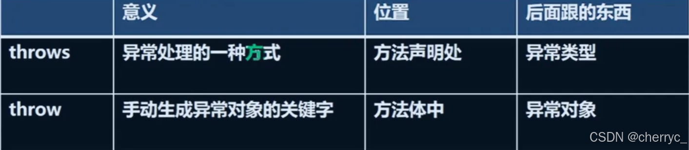 | 作用 | 主动抛出异常 | 声明可能抛出的异常 |