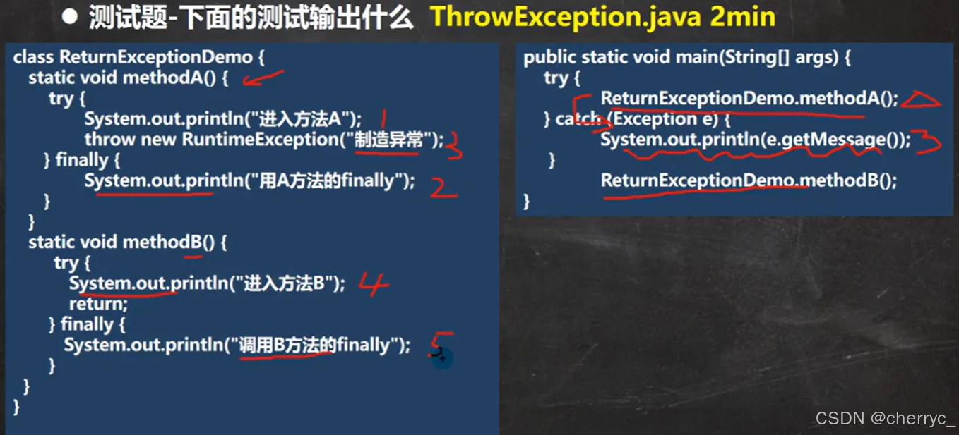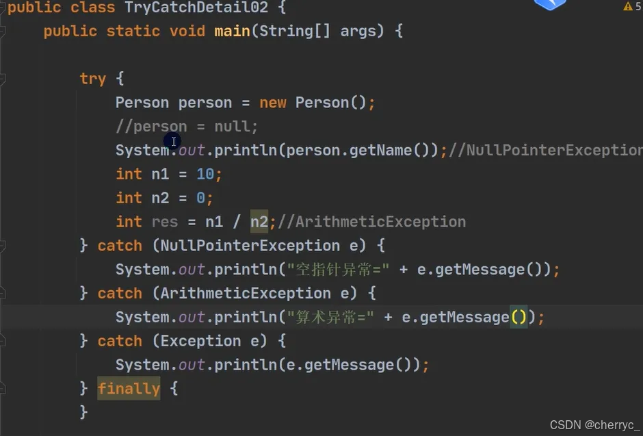 try-finally,相当于没有捕获异常,程序会直接崩掉(finally后),但在finally中的块还是会执行。 finally块中的return语句会覆盖try或catch块中的return语句:finally块的设计初衷是无论发生什么(正常执行、异常抛出、try/catch中有return),finally块中的代码都必须被执行。这个“必须执行”的原则优先级非常高。