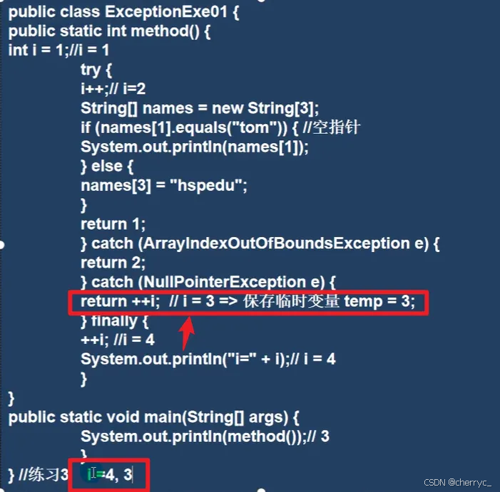catch (NullPointerException e)捕获异常,执行return ++i;:i先自增为3,然后return 3;(此时3被存入临时变量,但还未真正返回)