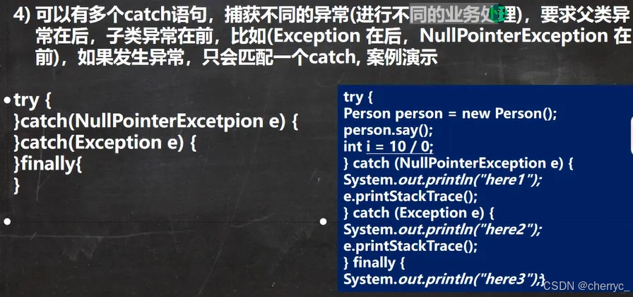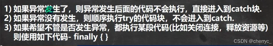 // 将异常发生时,系统将异常封装成Exception对象e,并传递给catch