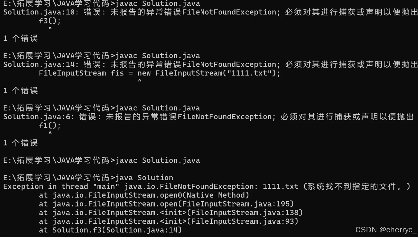 try-catch处理异常;调用它的方法(直到main)也是同样的要求(最终必须有一个方法处理异常(否则编译失败)) ,否则代码将无法通过编译。import java.io.FileInputStream; import java.io.FileNotFoundException; public class Solution { public static void main(String[] args) { f1(); } public static void f1() { f3(); } public static void f3() { FileInputStream fis = new FileInputStream("1111.txt"); } }