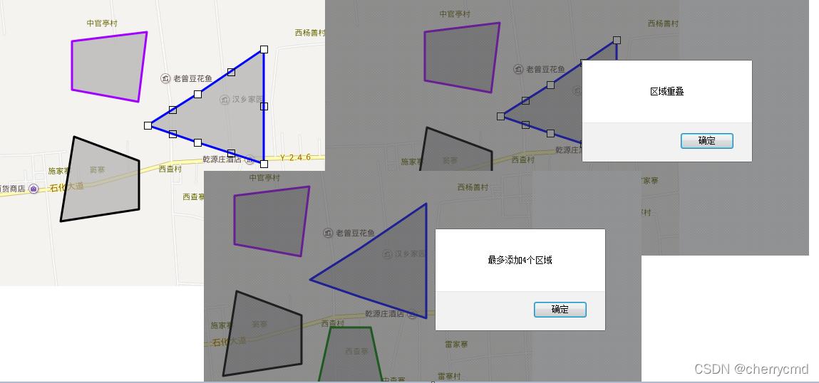 最近遇到一个业务就是需要需要在地图上标记多个区域。一般餐饮业做外卖的,配送范围一般是多区域的,那么在地图上标记配送范围的时候就需要能标记多个区域。长话短说,最初的实现原型的截图如下: