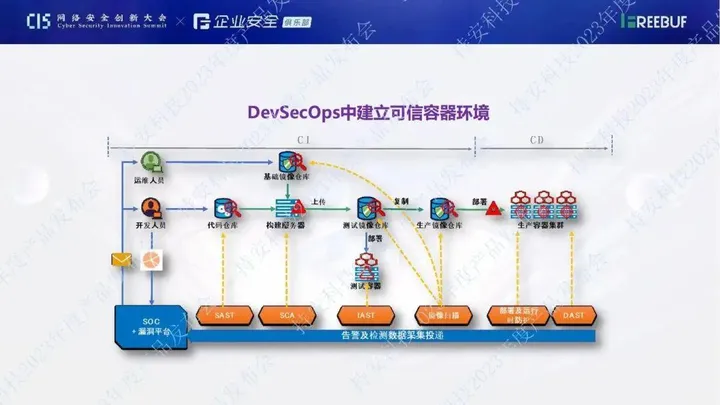 比如开发人员在代码仓库中提交代码时做检测,确保代码是可信的;构建服务器的时候,拉取的技术镜像也是可信的;测试环境部署的时候,也会通过多种方式来检测代码层的漏洞,然后部署到生产镜像库,在生产集群里生成的容器,也要是可信的。最终,所有的安全能力采集到的所有数据,通过数据投递的方式,整合到SOC平台,通过漏洞平台,反馈给开发人员和运维人员,形成一体化管理。