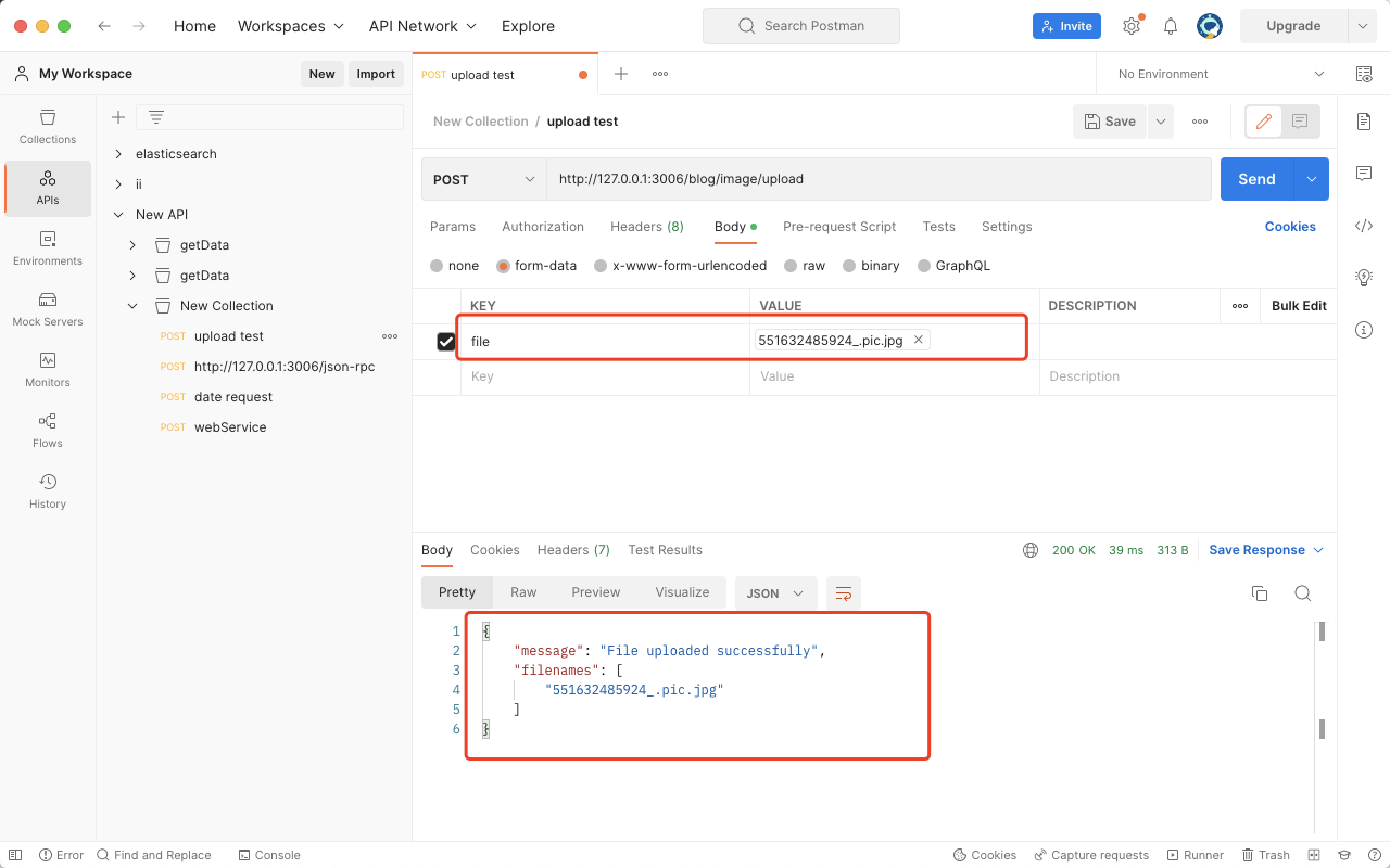 文章原文配图包括后端接口实现截图及Postman操作界面和文件上传字段设置画面,对调试流程不了解的同学跟着操作图做一遍会很有帮助。