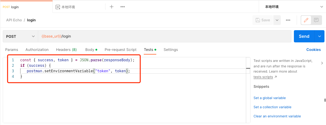 实际走下来,整个流程包括:第一步在环境变量中创建token变量,初始值可以为空;然后发送登录接口请求,拿到响应里的token,进入Tests标签下写脚本,把响应体中的token用代码提取出来自动赋值给环境变量。这样后续需要认证的API接口里,直接在Authorization区域选Bearer Token,再输入{{token}}占位符就可以自动带token值了。每次重新登录、token发生变化时,环境变量会自动更新,不用手动复制,调试与接口联调都很方便,也适合接口自动化测试场景。