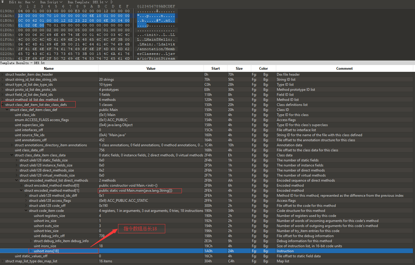 使用工具,将上面源码编译成dex文件,用 010编译器 打开 :