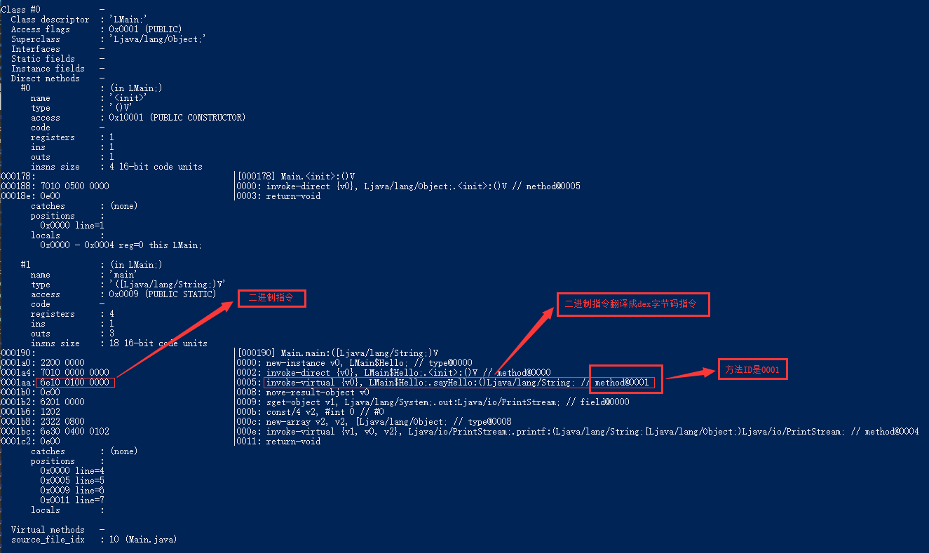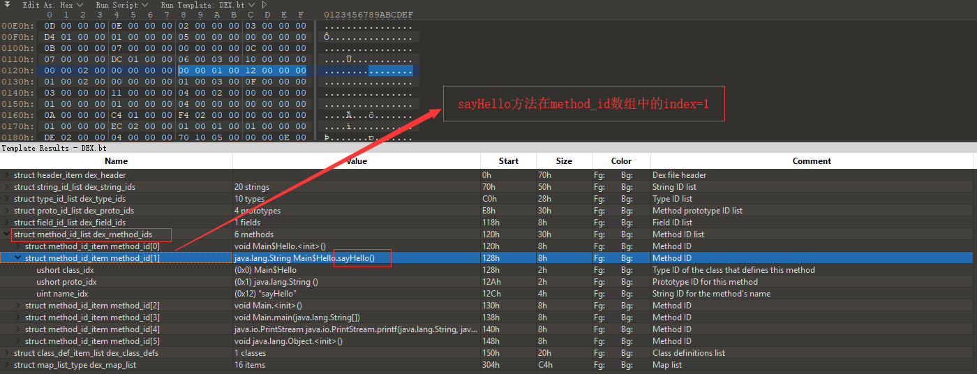 在method_ids 数组中,准确找到了index=0x0001 的对应方法为 Main$Hello.sayHello() 。