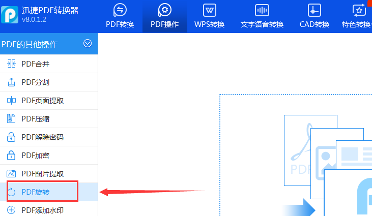 2、此时先将PDF转换器打开,用鼠标点击界面上面的【PDF操作】,接着在点击界面下面的【PDF旋转】功能。