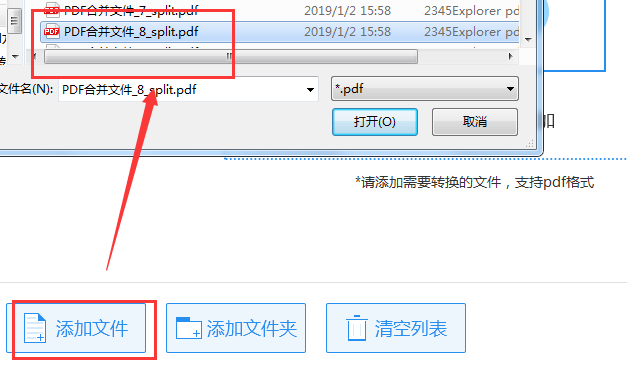3、接下来用鼠标点击界面下面的【添加文件】,在弹出的一个小窗口中,找到PDF文件,并点击窗口中的打开,将PDF文件添加到转换器中。