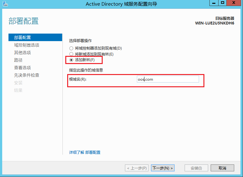 10.“Active Directory 域服务配置向导”,这一步是“部署配置”,选择“添加新林”,并指定“根域名”后,点“下一步”
