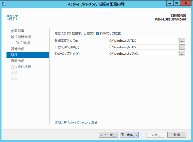 14.“路径”,指定ADDS数据库、日志文件和SYSVOL的位置,可保持默认,点“下一步”