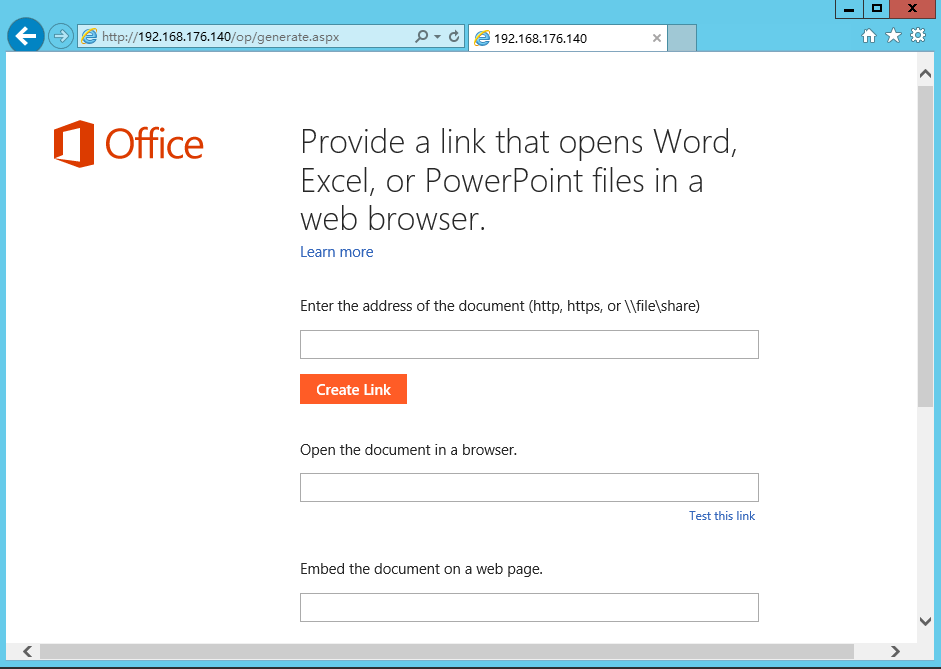 将 http://myscloud.cn/test.xlsx 输入到 http://192.168.176.140/op 访问页面的第一行,然后点击create link即可生成浏览网址,点击test this link进行测试