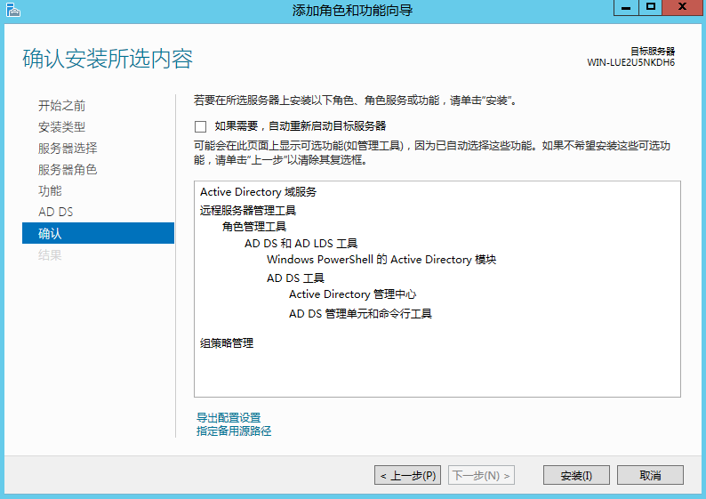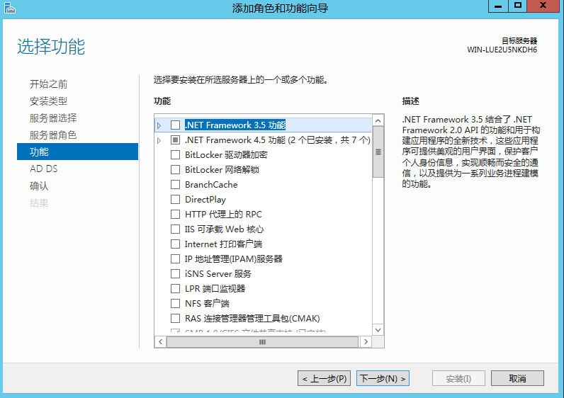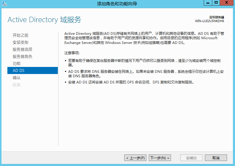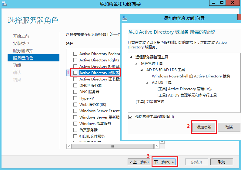 5.“服务器角色”,选择“Active Directory 域服务”,这时会弹出一个框“添加角色和功能向导”,点“添加功能”,然后点“下一步”
