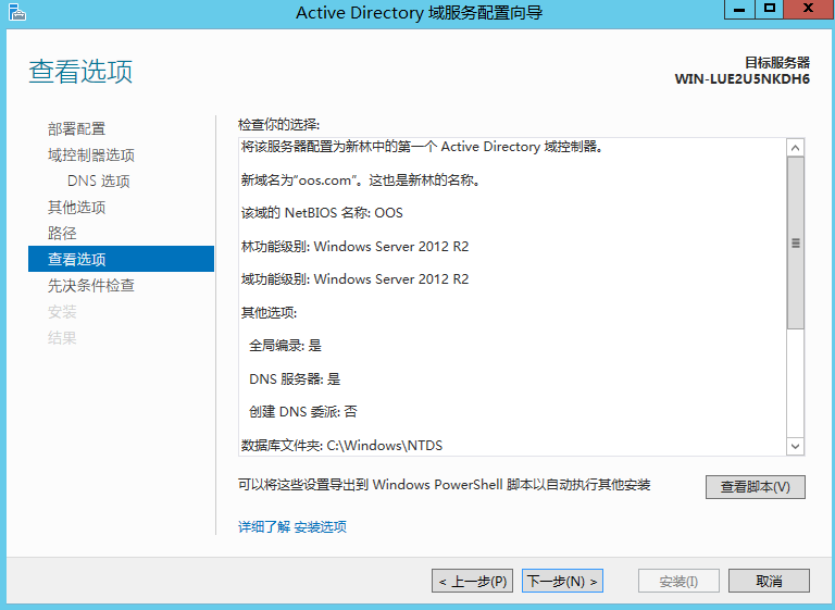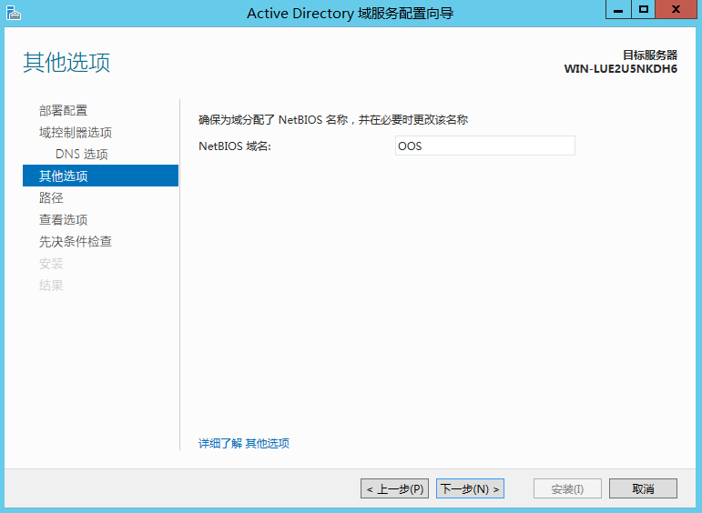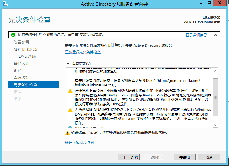 16.“先决条件检查”,这一步要求Administrator用户设有强密码(若没有设置密码,可先设置密码,然后选择上一步重新走一次),检查通过后,点“安装”