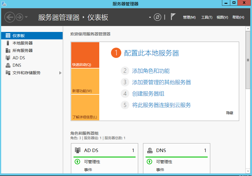 18.重启后,打开“服务器管理器”,能够看到左侧面板的“AD DS”,至此安装配置结束。