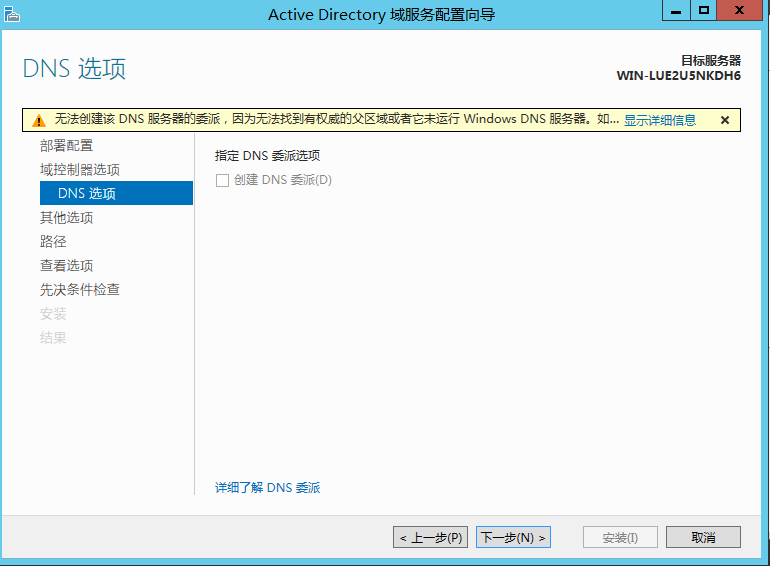 12.“DNS选项”,提示“无法创建该DNS服务器的委派......”,不管它,点“下一步”