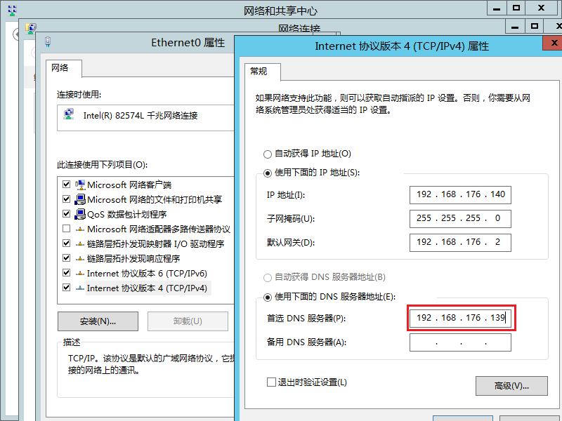 4.配置DNS,将DNS配置为AD域服务器的ip地址