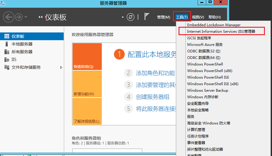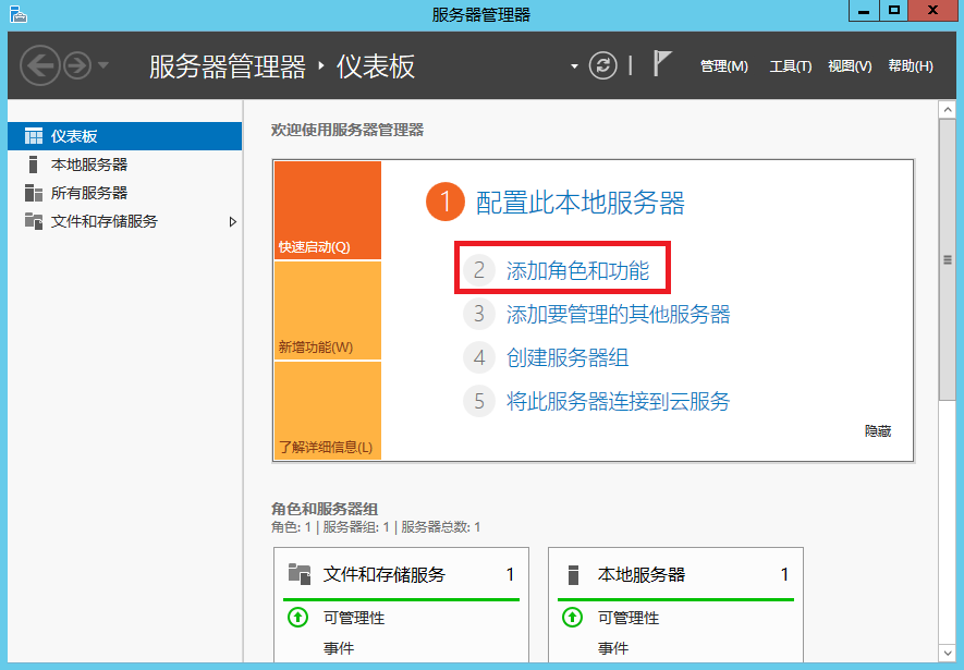 1. 打开“服务器管理器”,点击“添加角色和功能”